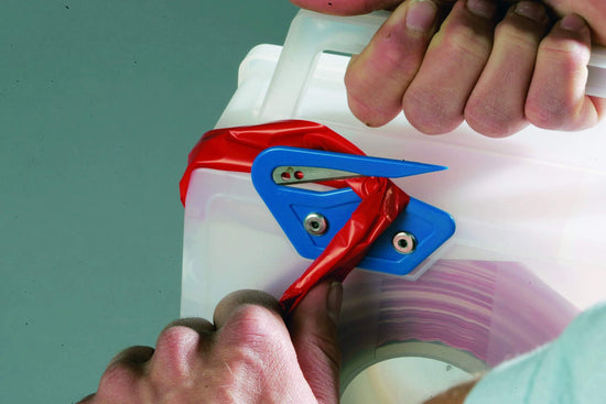 Hånddispenser med kniv, til brug ved ophængning af markeringsbånd.